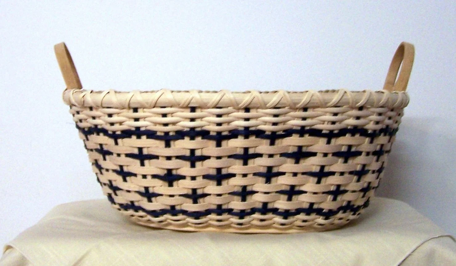 Class Descriptions: Mini Laundry is woven on an oval hardwood base. Techniques include – chase weave, start and stop weaving, overlay. Shaping strongly emphasized. Basked completed with flat oval rims and inserted bushel handles. Some color choices will be available. Dimensions: 14” long; 12” wide; 5” tall