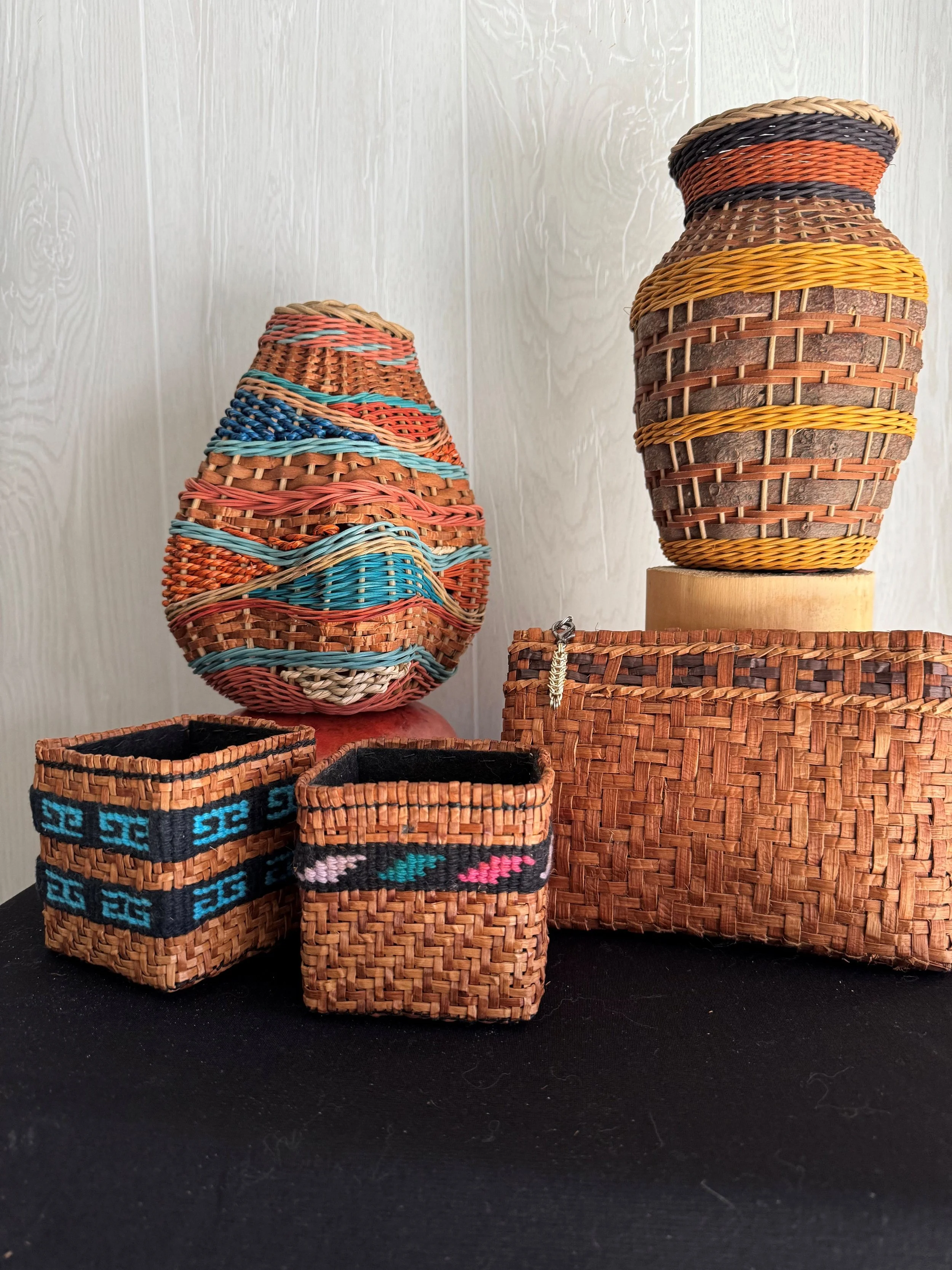 Being formerly from Michigan, her materials were Birch Bark, Eastern White Cedar, and numerous pine barks. Her gratification is creating legacies to these trees.